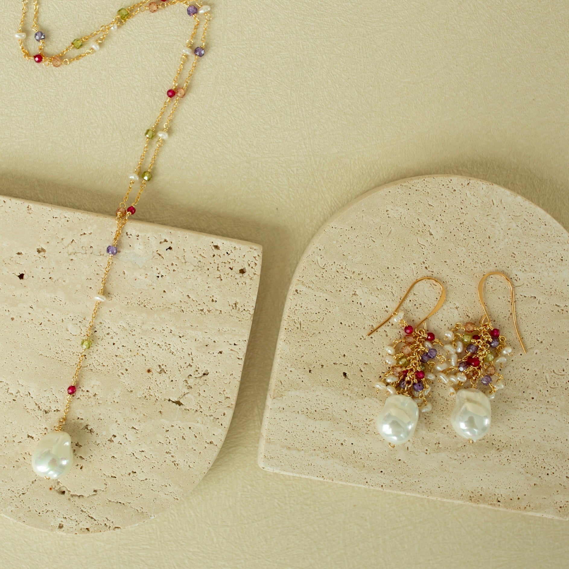 Available in four gemstone combinations and handmade by our team of local female artisans. Full drop length is 1.5". Handmade with 14k gold plated over fine Italian silver. Finished with delicate gold French Hooks.